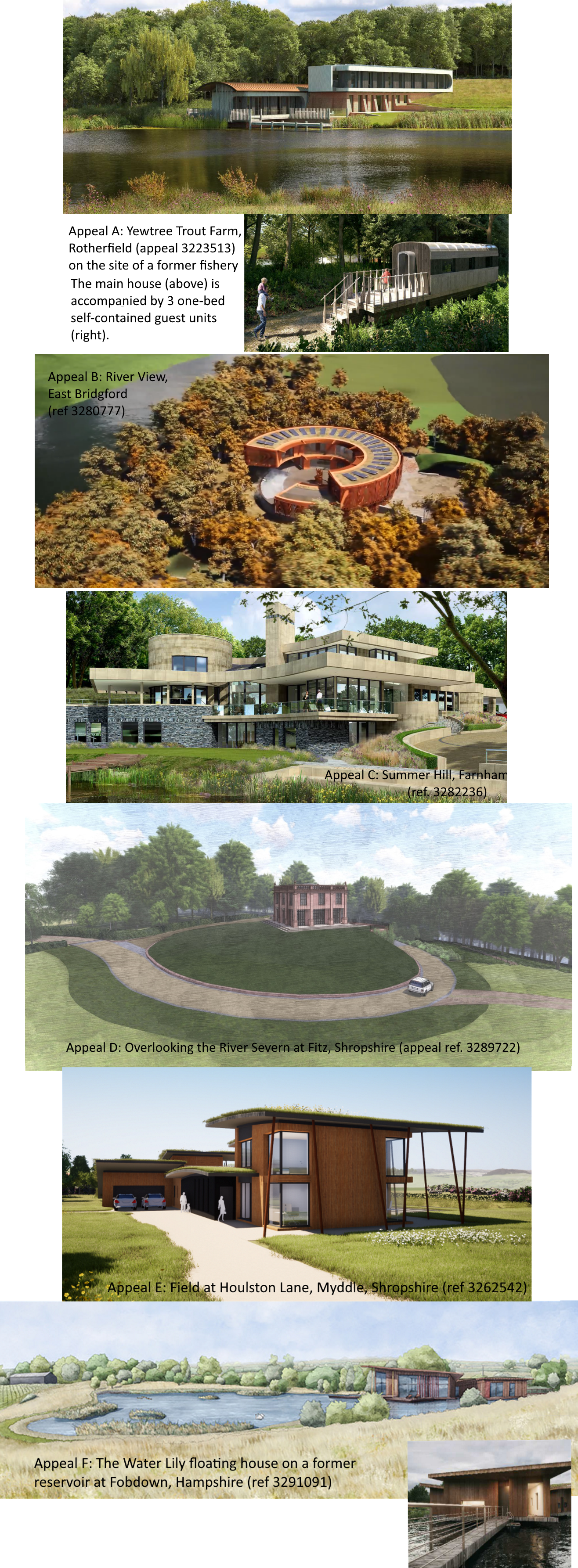 Six policy 80(e) appeals are sketched below. Three were allowed and three dismissed, with as many valuable insights in those who lost as in those who won. Readers may wish to cast their bets now as to which of the designs were ultimately successful – all shall be revealed shortly.NPPF80e_appeals3.png